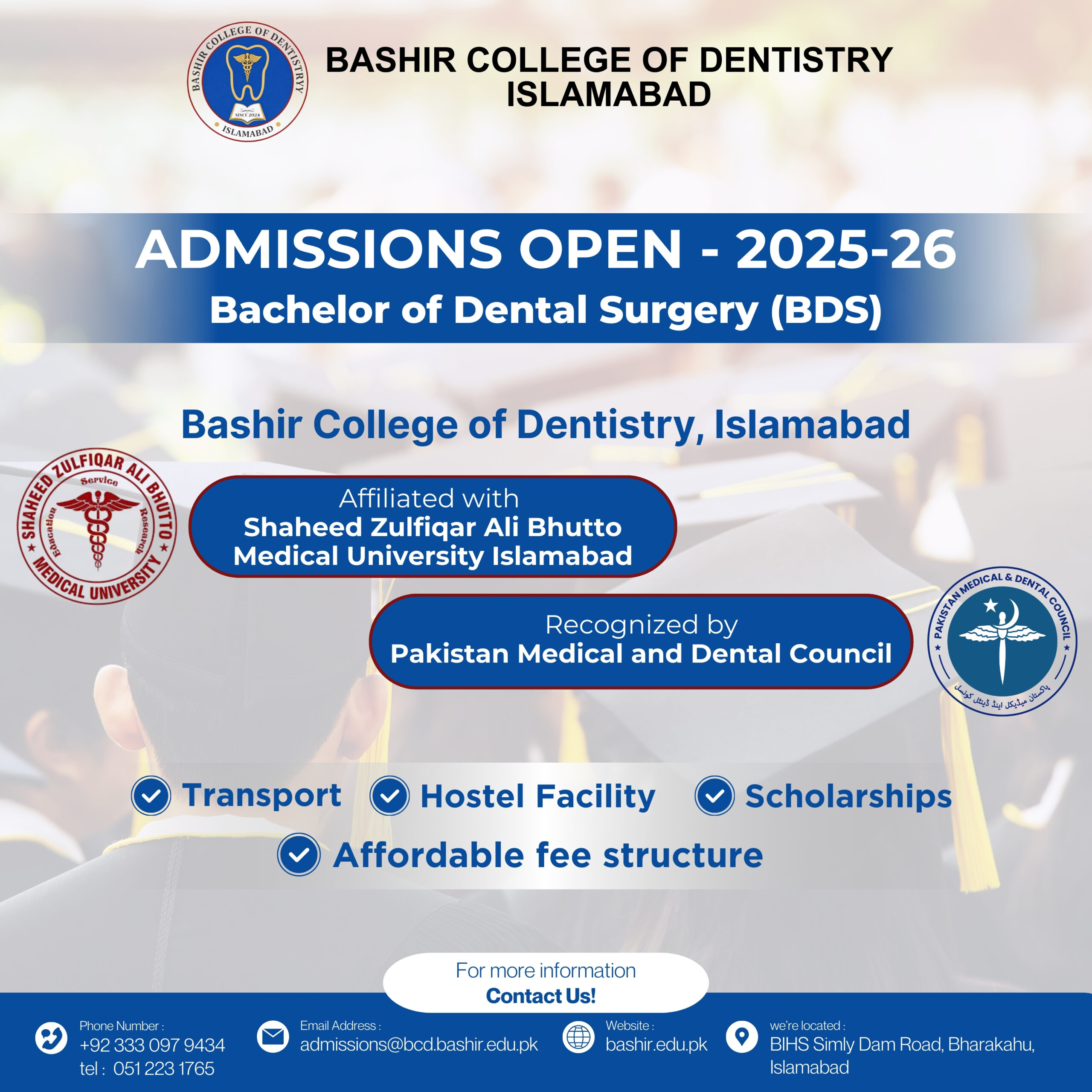 - 𝐄𝐦𝐚𝐢𝐥: admissions@bcd.bashir.edu.pk